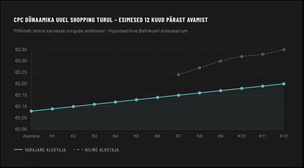 Kõikidel uutel turgudel on alguses sarnane muster: konkurents on madalaim käivituse esimestel kuudel. CPC (kliki hind) on madal, konkurents madal, ja Google’i algoritm premeerib varajasi aktiivsete konversioonidega kontosid.